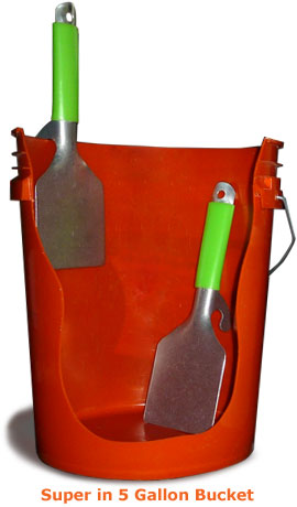 The Super BucketScoop is designed for use with 2 gallon and larger sized containers. Patented Monkey-Thumbs™ allows scoop to hang from edge of bucket to keep the handle out of the mess!